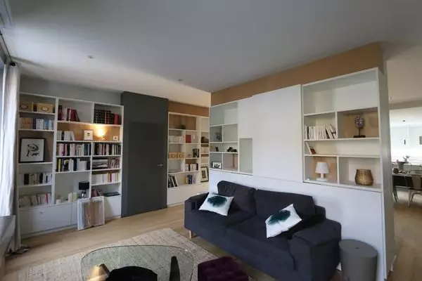 Les pièces à vivre et les espaces multifonctions. L’agencement des pièces à vivre – salons, séjours, salles à manger – repose sur un savant équilibre entre confort, circulation fluide et mise en valeur des volumes. Nous concevons du mobilier intégré : banquettes, bibliothèques, meubles TV, cloisons décoratives, en cohérence avec l’identité visuelle de l’habitation. Notre maîtrise de l’agencement bibliothèque sur mesure est particulièrement appréciée des amateurs de lecture et de design intérieur : nous concevons des bibliothèques murales, des niches sur mesure, ou encore des ensembles combinant rangements et éléments décoratifs, dans des essences de bois nobles et des finitions soignées.